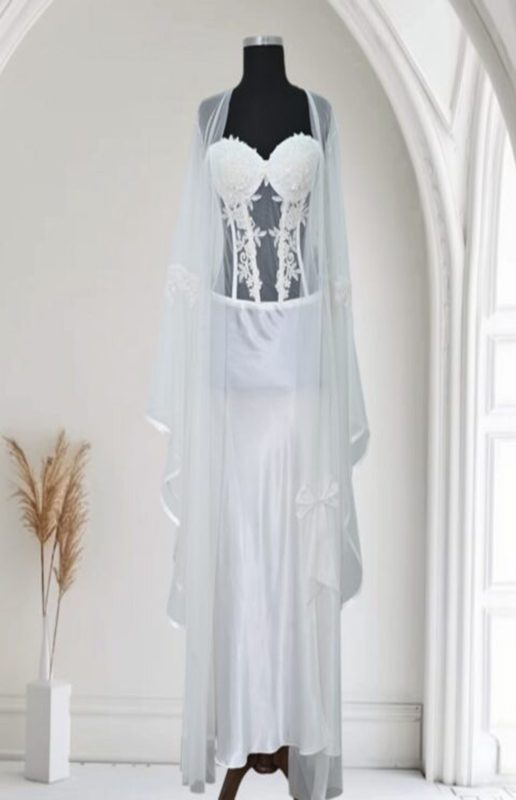 سيت عرائسي ساتان قصير مع مشلح طويل من التول مع الدانتيل الفاخر.